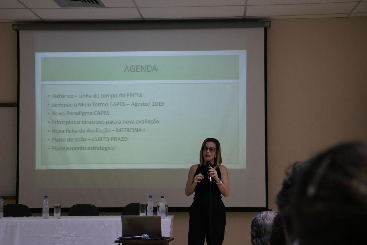 Na sequência, a Profa. Dra Yara Cristina de Paiva Maia ministrou a palestra intitulada Perspectivas da nova avaliação quadrienal: mudanças de paradigmas. A professora apresentou a linha do tempo do PPCSA, o plano de ação a curto prazo e o planejamento estratégico do programa. Destacou a relevância de unir esforços individuais numa estratégia de grupo que oriente os ajustes necessários para que o PPCSA seja bem avaliado ao término deste quadriênio e também permita iniciar o próximo quadriênio de maneira forte, coesa e consistente em busca da excelência.