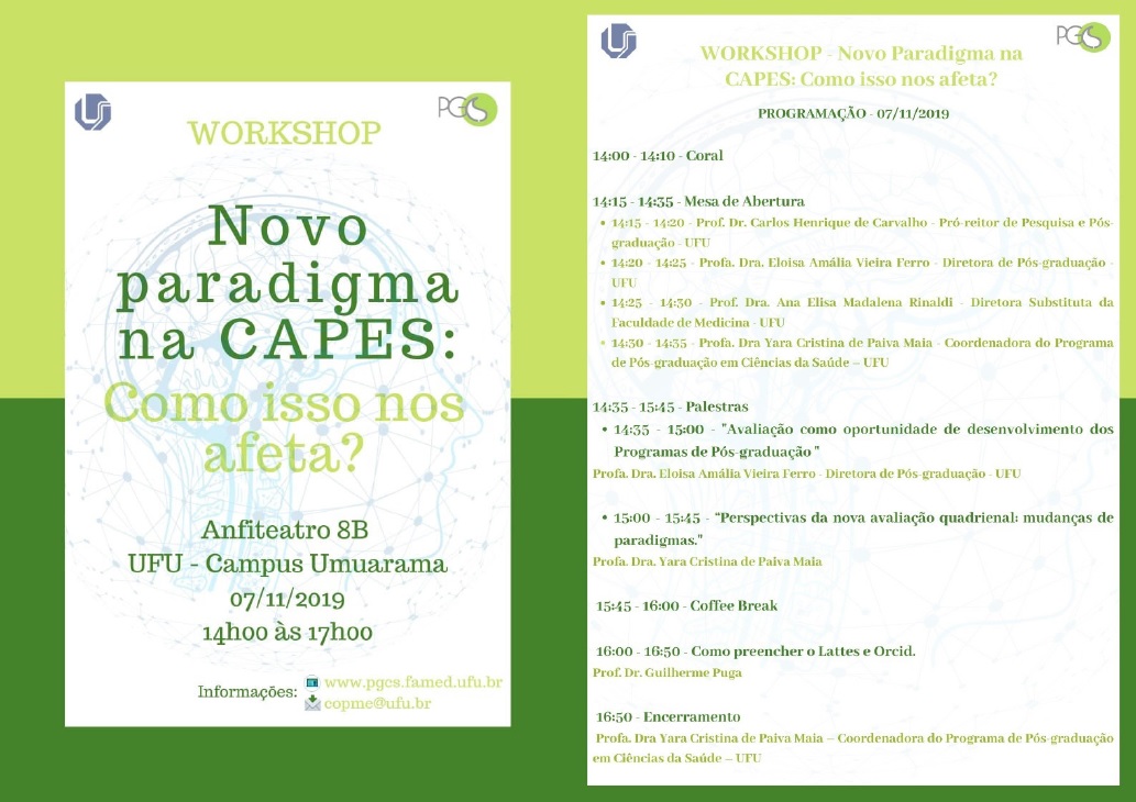 No dia 7 de novembro de 2019, o Programa de Pós-graduação em Ciências da Saúde (PPCSA) promoveu o Workshop intitulado "Novo paradigma na CAPES: como isso nos afeta?". O objetivo do evento foi discutir as novas diretrizes de avaliação da Coordenação de Aperfeiçoamento de Pessoal de Nível Superior (CAPES) para os programas de pós-graduação do país e os impactos gerados por esse novo modelo.